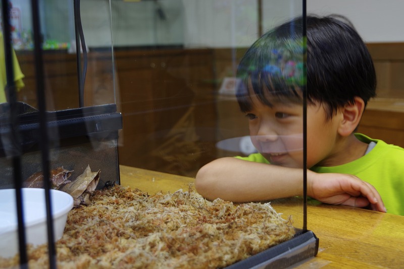 ベトナムコケガエルを見つめる目は真剣です。もしかしたら「このカエルも触りたい」という思いが込みげているのかもしれませんね。