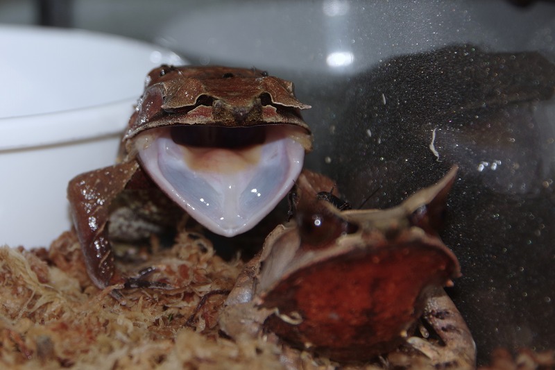 アマゾンツノガエルとクランウェルツノガエルの交配種であるファンタジーツノガエル。8個食べた後、追加で2個。「もうお腹いっぱいだよ」の表情?
