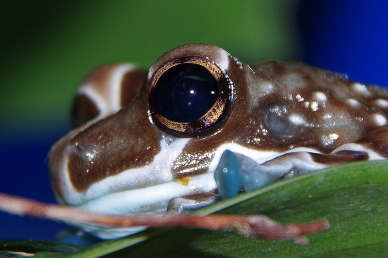 こちらはジュウジメドクアマガエル。虹彩の部分に黒い模様があり、十字に見えることが名前の由来です。小さい時よりも虹彩の黒色が薄くなったようですよ。