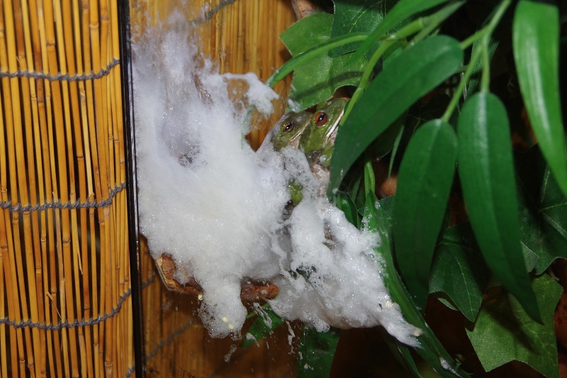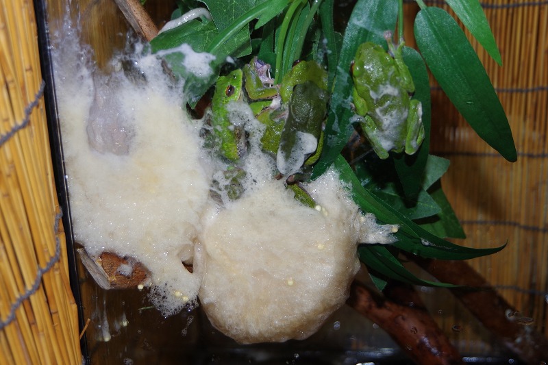 今の時期、長野県の各地ではモリアオガエルが産卵期を迎えています。『あめあめ ふれふれ カエル展』のモリアオガエルも、朝から産卵を始めましたよ。