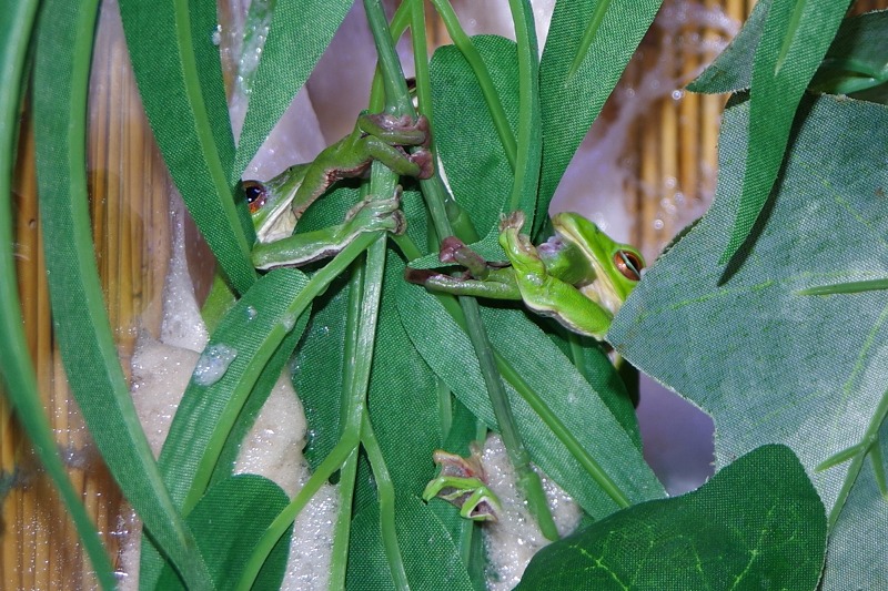 シュレーゲルアオガエルのオタマジャクシに餌をあげた後は、木の上に並ぶアマガエルを数えます。お気に入りのアマガエルは定番の緑色だそうです。