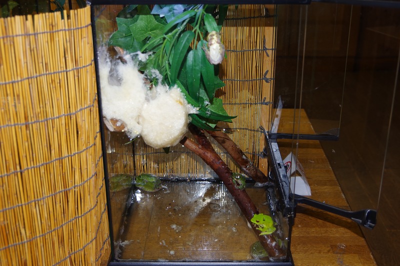 飼育ケースを覆っていたヨシズを開けて観察。ガラスやガーランドに泡状の卵塊を産み始めた所です。自然では池の上に張り出した樹木の葉に産卵します。