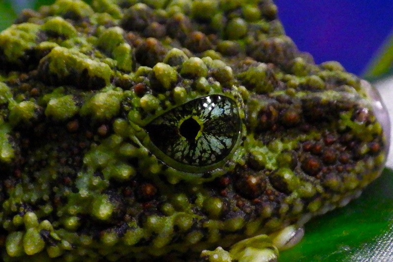 目を拡大すると虹彩の部分も緑と黒の模様になっていて、細部まで苔に似せるこだわり様です。日中じっとして休息状態でも、いつも目を開けています。