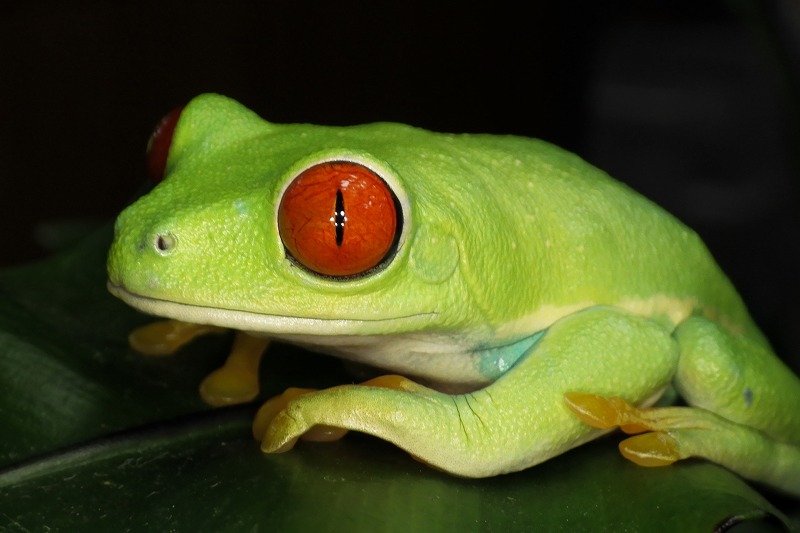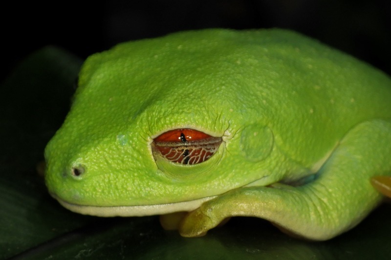 真っ赤な目が印象的なアカメアマガエル。明るい時に起こすと猫目状態です。夜間真っ暗になると瞳孔が大きく開いて、黒目の面積も大きくなります。