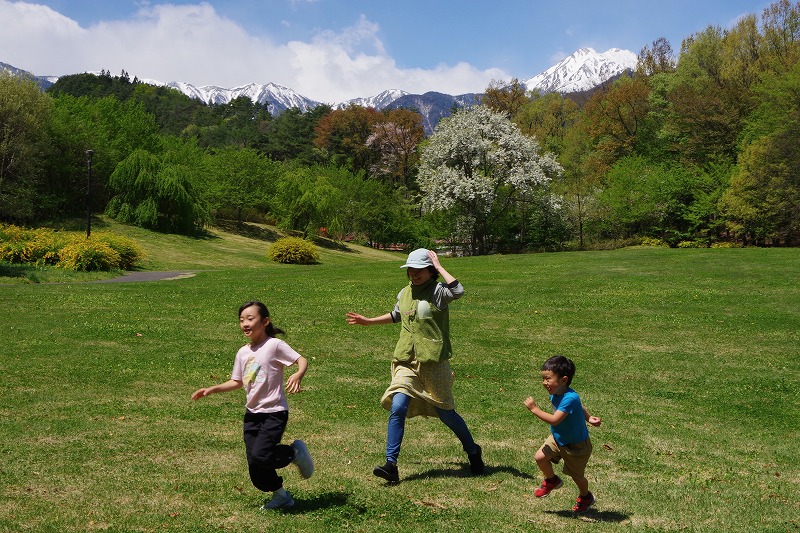 野の休憩所前。北の方角には大町市の爺ヶ岳も望めます。ダイナミックな借景を楽しめるのも、あづみの公園ならではですね。