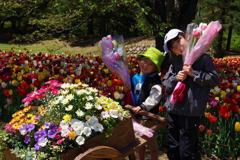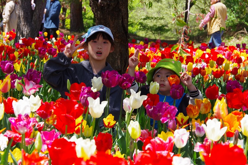 田園文化ゾーンのチューリップは遅咲き品種も咲き始め、全体が見頃になっています。今がピークのチューリップに「良いお顔」が全開の2人なのでした。