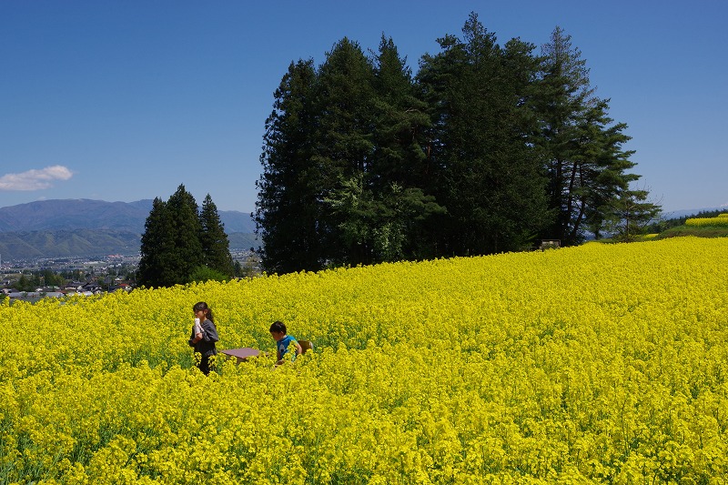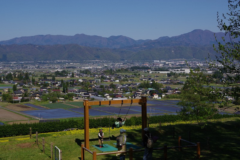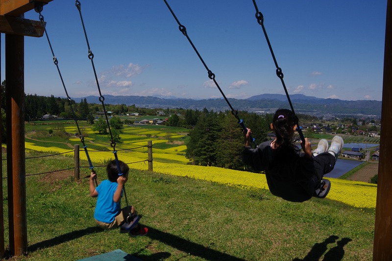 棚田エリア最上段の展望広場にあるブランコにも乗りました。黄色い絨毯を見下ろして乗るブランコは気分爽快。安曇平に飛び出していきそうですね。