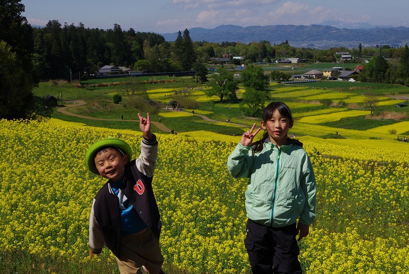 里山文化ゾーンのナノハナは今がピーク。満開のナノハナに笑顔も満開です。
