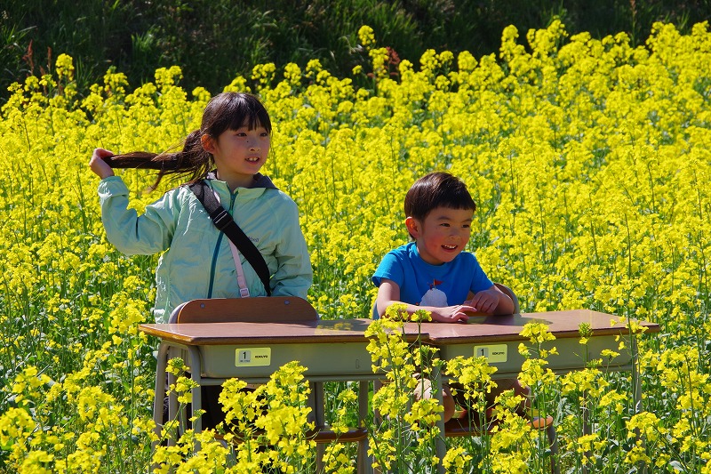 ナノハナに囲まれた「勉強机と椅子」のフォトスポット。4月から1年生のちーたんは早くも慣れた様子。年中さんのおたまくんは、まだ初々しいのです。