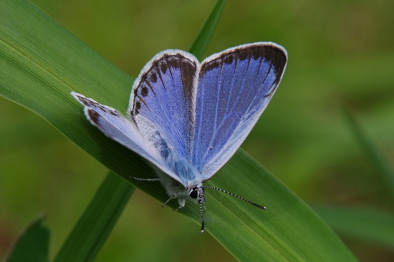 表翅は鮮やかな瑠璃色をしています。前翅の黒い縁取りの幅が狭いのがオス。例年メスよりも少し早く羽化します。