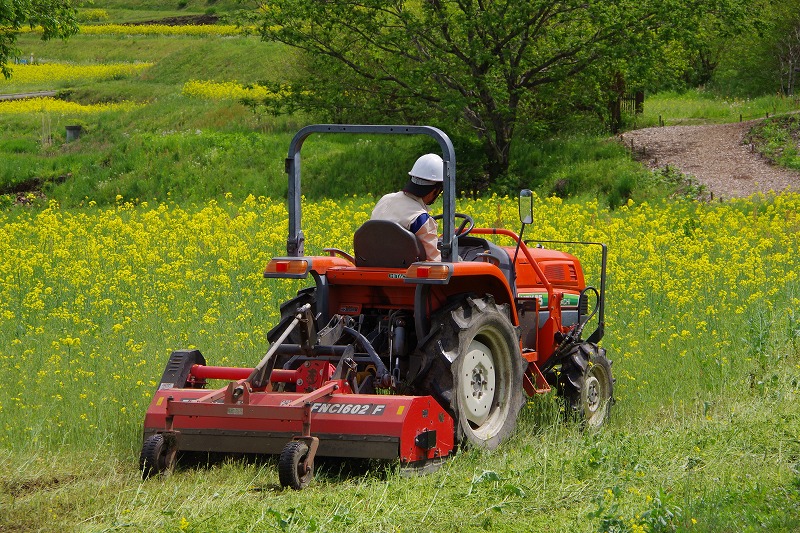 里山文化ゾーンのナノハナも花が減って黄色が薄くなりました。岩原口周辺から刈り取り作業も始まっています。こちらも見頃過ぎです。