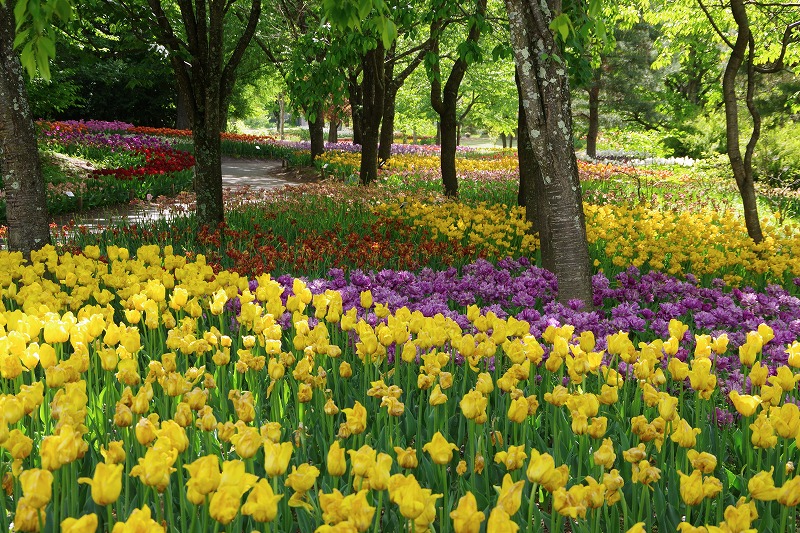 たくさんのチューリップをまとめて撮りたい時は、花が幾重にも重なる場所を探してズームにすると、画面いっぱいに鮮やかなお花を収めることが出来ます。