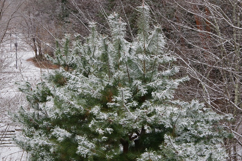 展望テラス2階からアカマツが下に見えます。細かい雪が枝や葉に付いて、パウダーを振りかけたようにも見えますね。クリスマスツリーっぽい感じです。