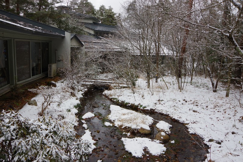 あづみの学校の横を流れる小川周辺も雪景色です。林に囲まれていても雪が降ると結構積もります。芸術教室からもきれいな雪景色を見ることが出来ますよ。