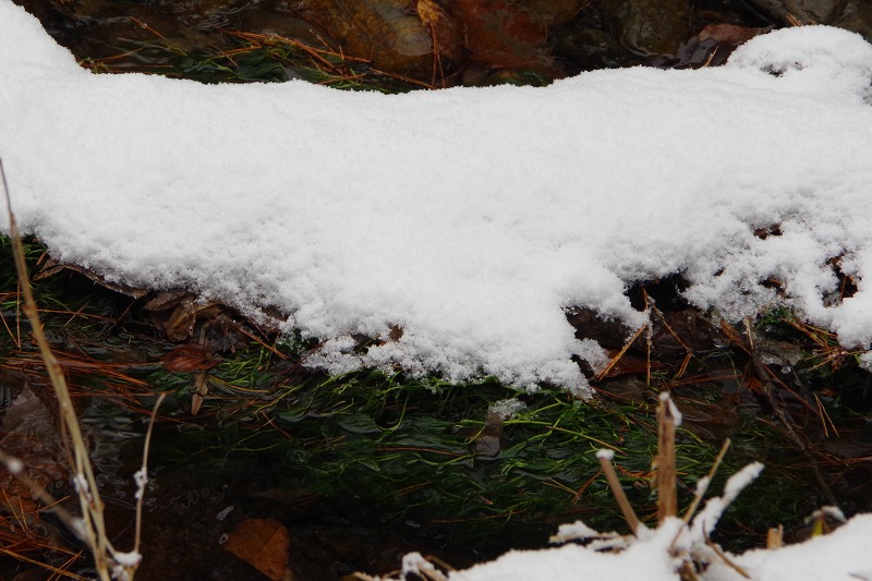 冬の時期は水量も減るので、川の中のバイカモも水面上に出ることが多くなります。雪が積もってもバイカモは枯れることはありません。結構タフなのですね。