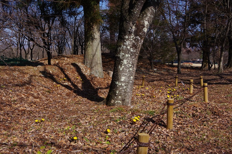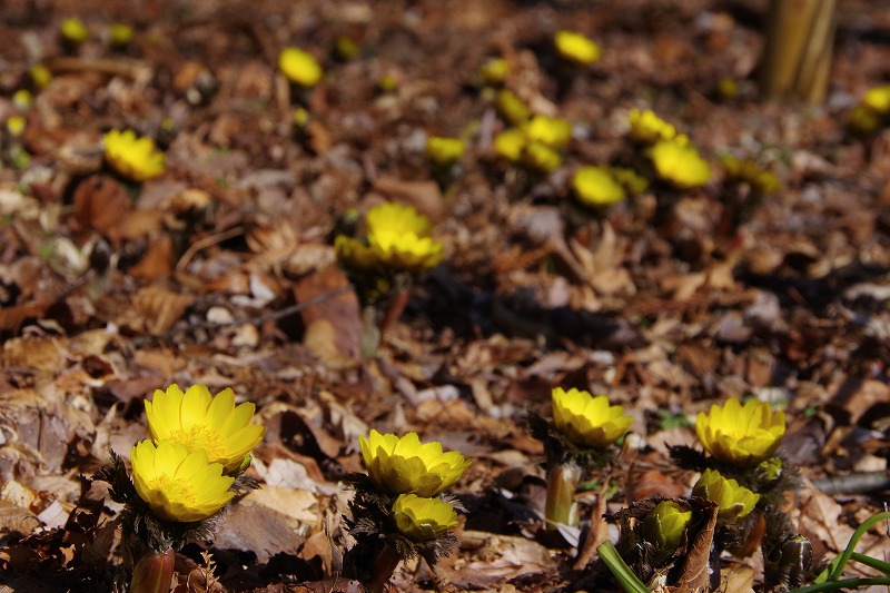 水辺の休憩所北側、古墳の一角にはフクジュソウが咲いています。少し前には数輪だったのに、今朝見るとかなりの数が地面から出ていました。