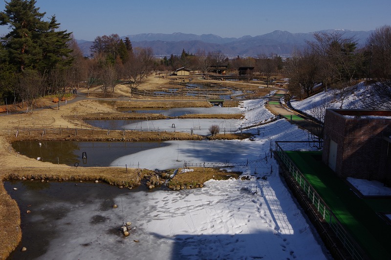 今日は公園外の話題です。常念岳から蝶ヶ岳の北アルプスの山並みを望む冬の田んぼ。集まっているのはコハクチョウです。すぐ後ろは長野自動車道。観察していた人の話によると、近くにある「犀川白鳥湖」から飛んできているそうです。