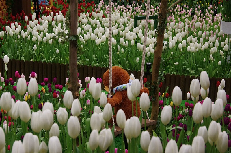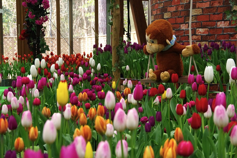 ブランコに乗った〝おさるのジョージ〟も嬉しそうです。少し下を向いていますが、きれいなチューリップをじっと見つめているようで可愛らしいですね。