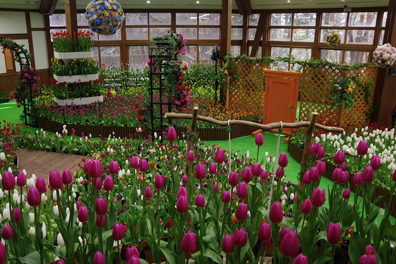 会場入り口の方向。上からぶら下がる、くす玉のような球形の造花が可愛らしいですね。3段に積み上げたチューリップの塔も見下ろしますよ。