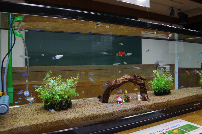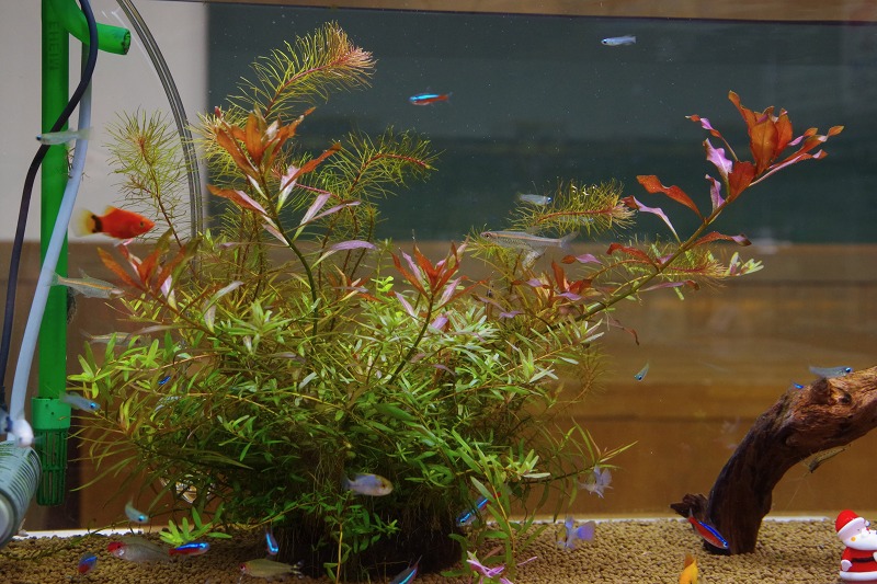あづみの学校理科教室の特別展示『トロピカル クリスマス』の水草水槽。展示開始から3週間。水草たちが成長してだいぶ伸びてきましたよ。