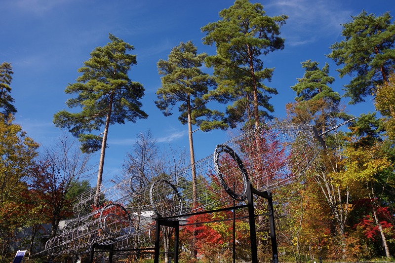 ガイドセンター前広場の「光の宇宙船」。下から見上げると今にも飛び出しそうで迫力満点です。昼間は無機質な骨組みも背景の紅葉に助けられています。