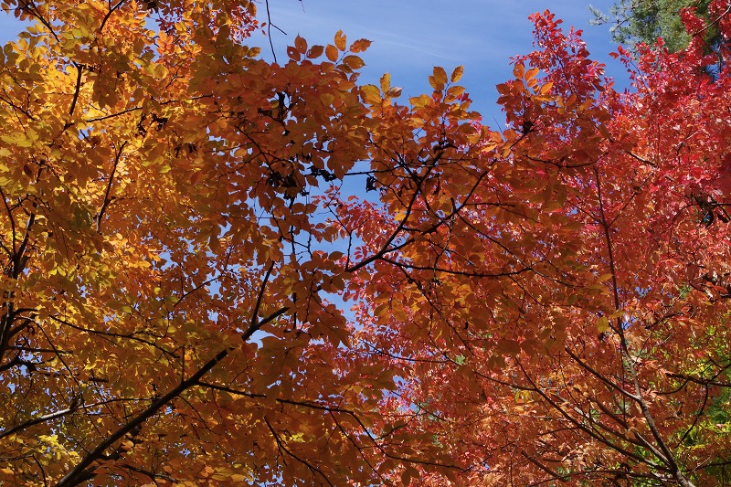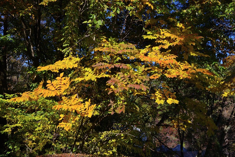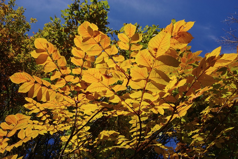 黄色く黄葉しているのはヤマウルシ。羽状複葉の葉が特徴です。下から見ると光が透過して明るく輝いて見えます。赤く紅葉する木も多く見られますよ。