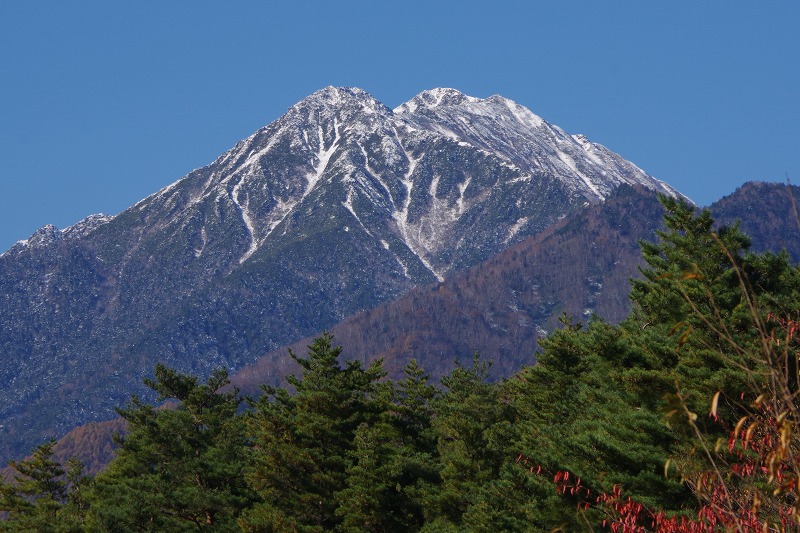 昨日の写真から紅葉と冠雪の様子をご紹介します。まずはお馴染みの池から望む北アルプスの山並み。常念岳から蝶ヶ岳の尾根は白い雪で縁取られていました。
