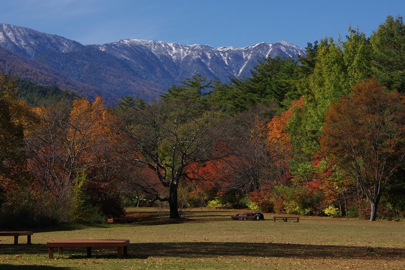 冠雪の蝶ヶ岳と野原の木々の紅葉。少し前までは芝生も緑色をしていましたが、秋が深まると少しずつ色が抜けて茶色くなっていきますよ。