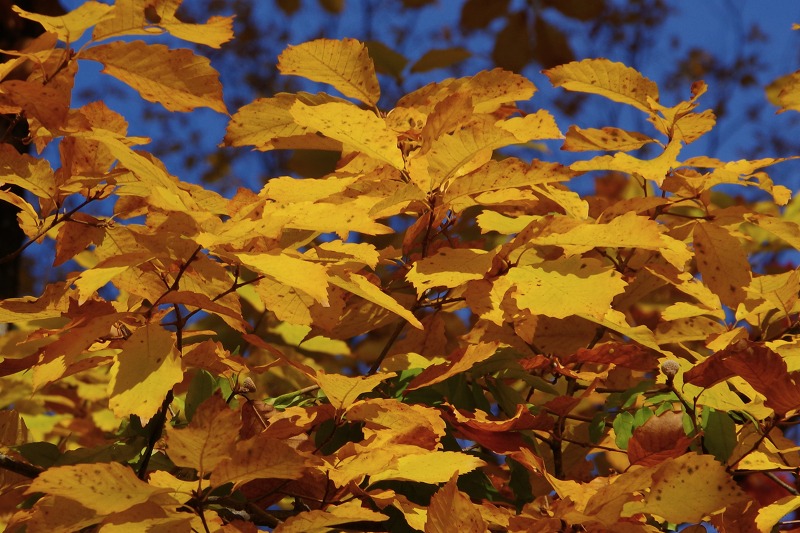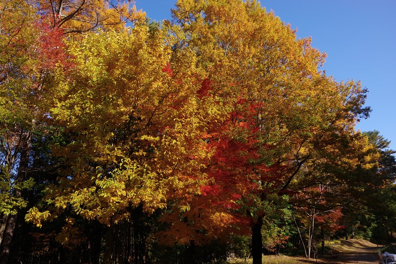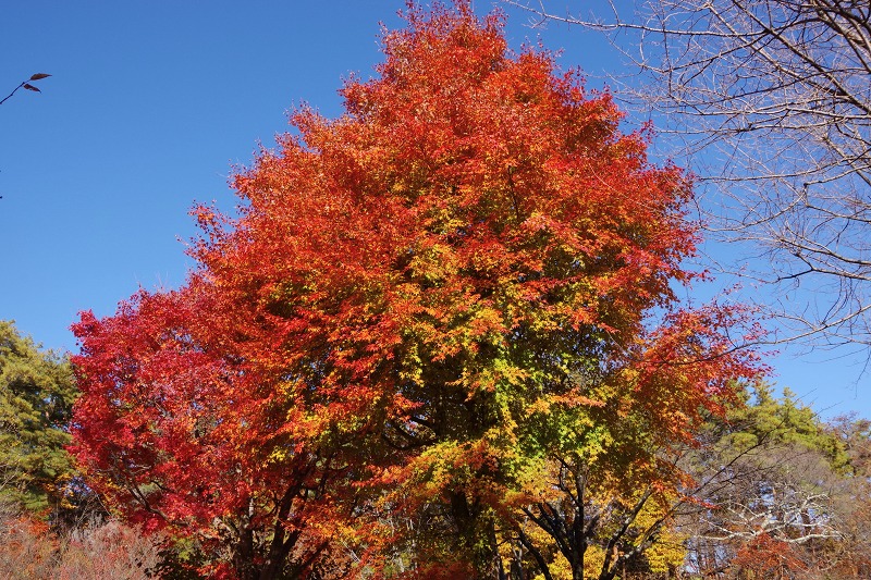 こちらは段々原っぱ前。真ん中はヤマモミジでしょうか。両脇のコナラとコブシの黄葉が、モミジの赤い葉を際立たせていますよ。