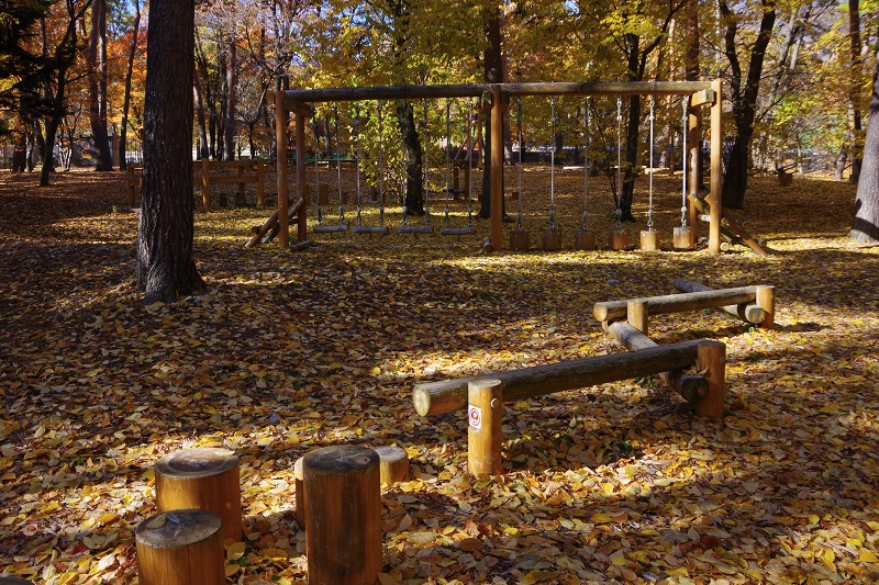 「冒険の森」でもたくさんの落ち葉。イルミネーション期間中の平日は穂高口は閉鎖していますが、土日祝は朝からご利用いただけますよ。明日から3連休です。落ち葉の絨毯が敷かれたアスレチック遊具で遊んでくださいね。