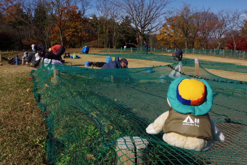 今日は休園日です。段々原っぱでは、チューリップの球根植え付け作業が続けられています。久しぶりの登場は〝かえるのピクルス〟です。〝シルバーズ〟の皆さんに混じって球根の植え付け作業。しっかりお手伝いしてくださいね。