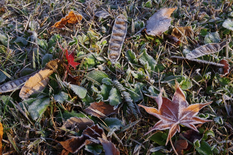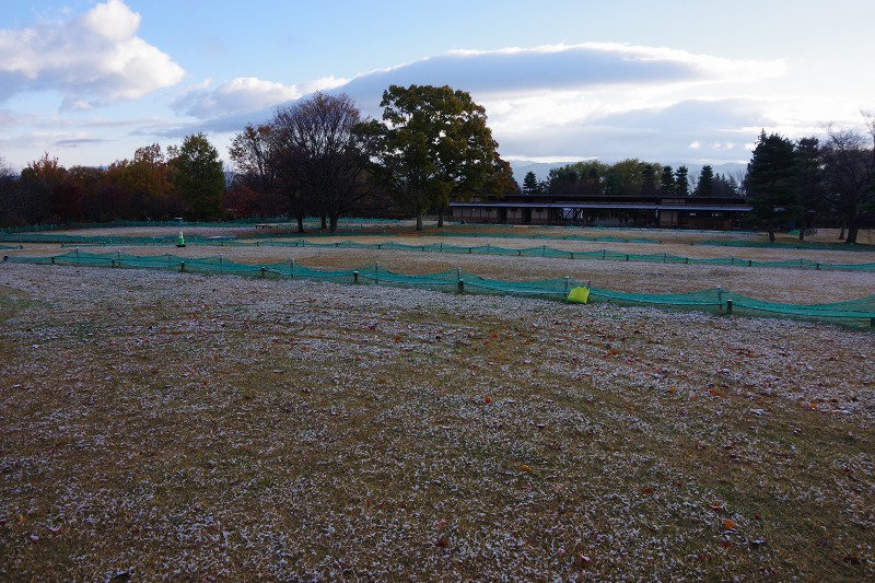 池の土手や芝生の上には霜も降りていました。昨日の雪と同じで日が当たり始めると、あっという間に融けてしまいます。早朝だけの光景ですね。