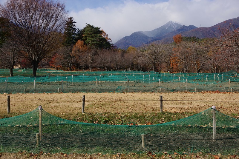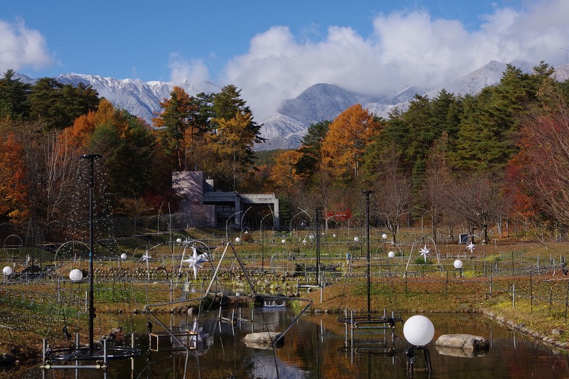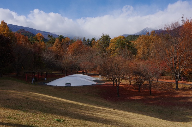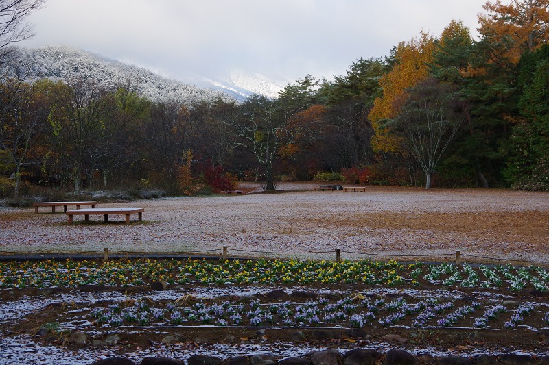 昨日は小雨が降った公園。雨は夜の間に雪に変わったようです。朝早く常念岳の麓の方では、雲の間から白く雪化粧した様子を見ることが出来ました。