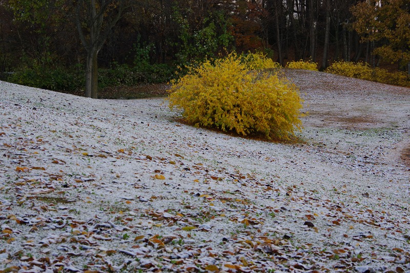 公園の中も、あちこちで薄っすらと雪が積もっていました。紅葉との共演も見られましたよ。公園では今シーズンの初雪&初積雪になりました。