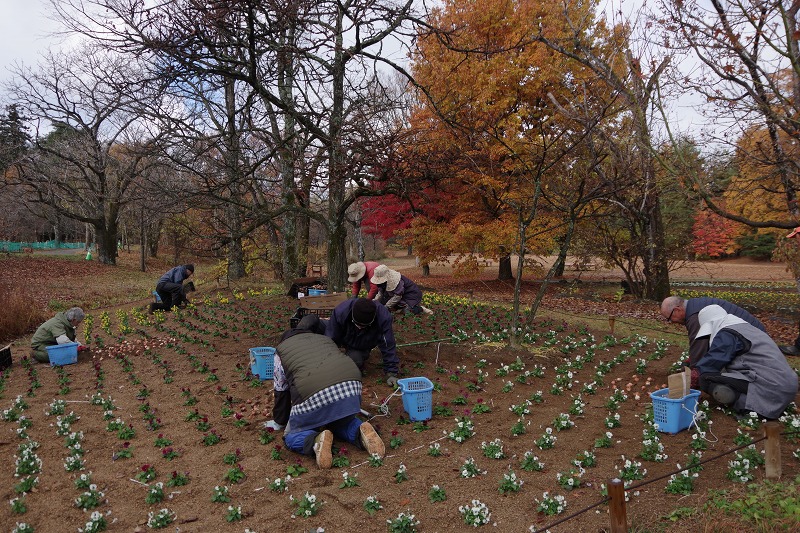 野原のビオラの花壇も作業終了。チューリップの球根植え付けは、これから池のの方へ向けてと作業が続きます。シルバーズの皆さんの奮闘もまだ続きますよ。