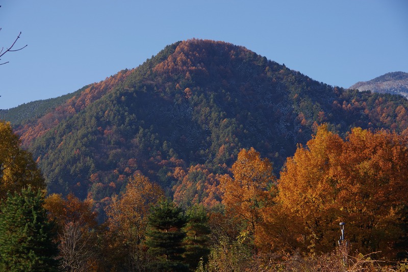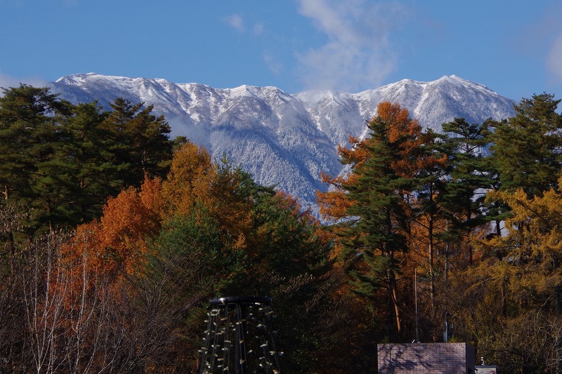 10時頃になって姿を現した蝶ヶ岳。青空を背景に、冠雪した北アルプスと紅葉したカラマツのコラボレーションが綺麗ですね。