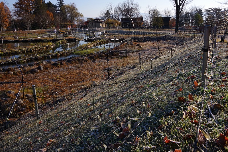今朝の公園は氷点下3℃台まで気温が下がりました。昨日は雲で見えなかった常念岳も綺麗に見えています。水辺の休憩所前の池には薄氷が張っていましたよ。