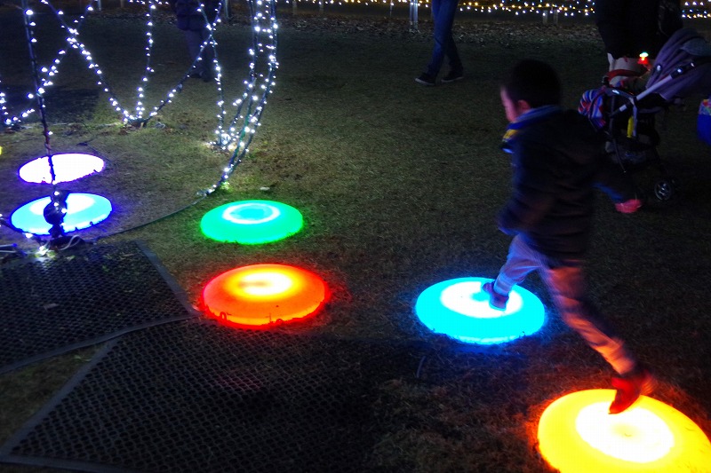 踏んだら色が変わる「レインボーステップ」は子供たちに大人気。順番待ちの行列ができるほどです。おたまくんも華麗に飛び跳ねます。