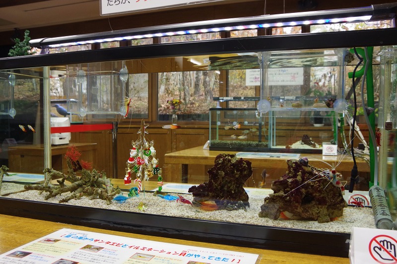 あづみの学校理科教室の特別展示『トロピカル クリスマス』の海水水槽。サンゴ岩の周りには、底に敷いているサンゴ砂が盛り上げられています。