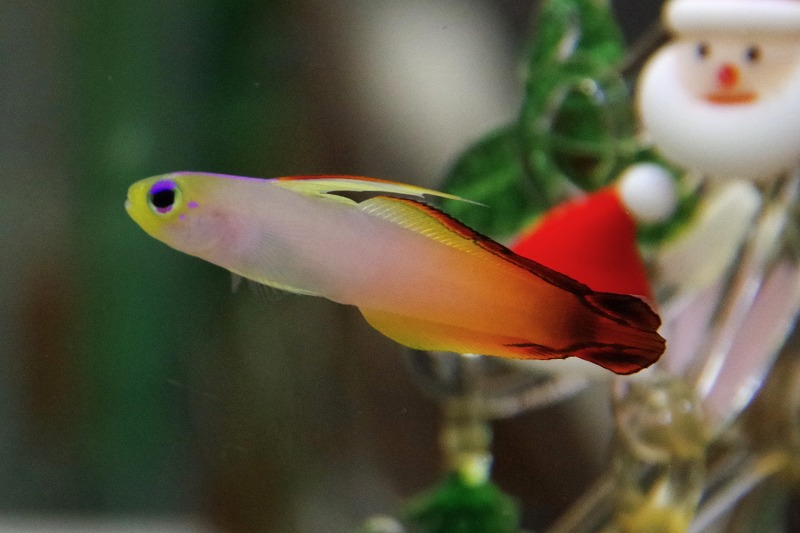 こちらはサンタエビやイルミネーション貝のいる海水水槽。最初はいなかったのですが、途中からハタタテハゼが仲間入り。長い背びれを立てて泳ぎますよ。