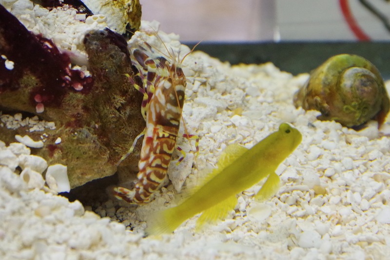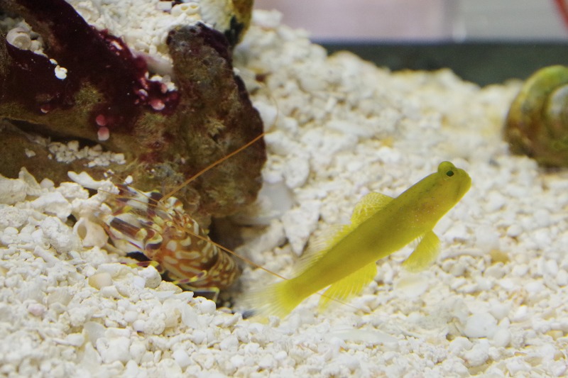 ギンガハゼはニシキテッポウエビが外敵から襲われないように見張りをしているのです。常にテッポウエビの近くにいて危険が迫ると合図を送り穴に隠れます。