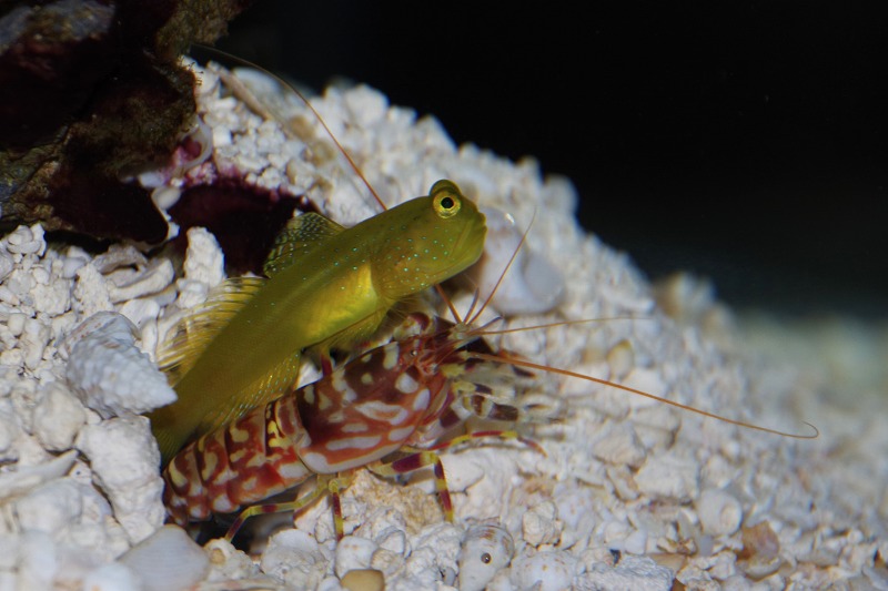 自分では穴を掘れないギンガハゼと、外敵に襲われやすいニシキテッポウエビの共生関係。お互いにメリットがある仲良しの2匹なのです。