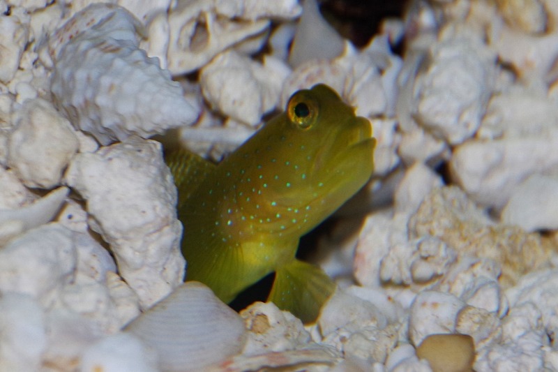 小さな穴から顔を出したのはギンガハゼ。顔や体にある青い斑点を、夜空に輝く星に見立てて付けられた名前です。このサンゴの山はギンガハゼの巣穴?