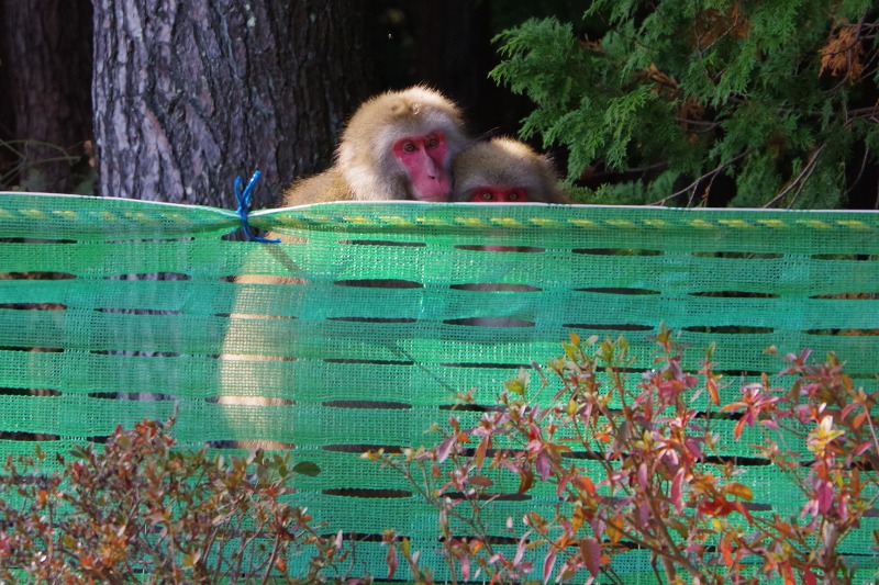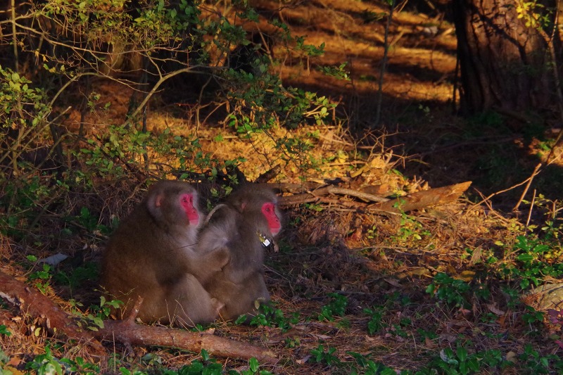 こちらは仲睦まじいペア。群れの中でも複数のカップルの姿が見られます。公園ではすでに終わったカエデの紅葉が、お猿さんの顔に引き継がれたようですね。