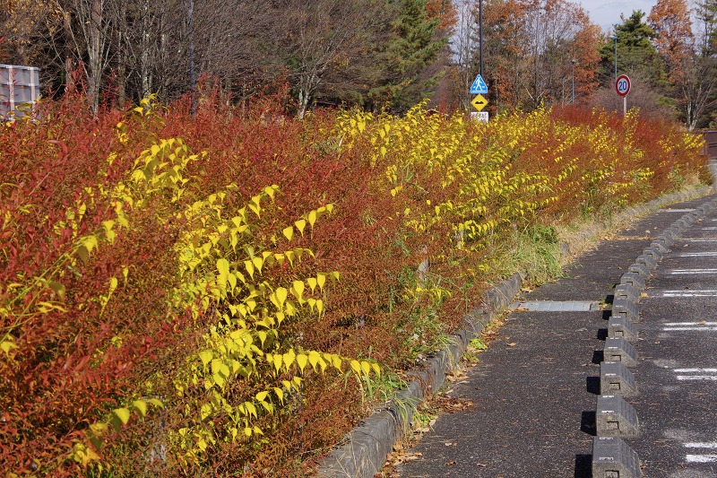 赤茶色のユキヤナギと黄色のヤマブキ。同時に見られるのは第1駐車場の植え込みです。特にユキヤナギが色付くと、紅葉もそろそろ終わりになりますよ。