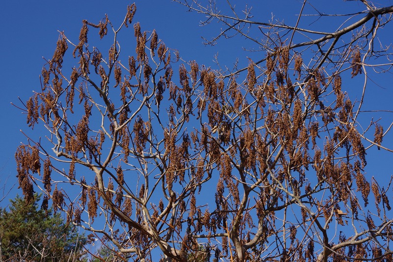 茶色の塊がぶら下がっているのはリョウブの実。色といい形といい、鬼太郎の世界をイメージするのは私だけ?冬になると小鳥たちの貴重な餌になります。