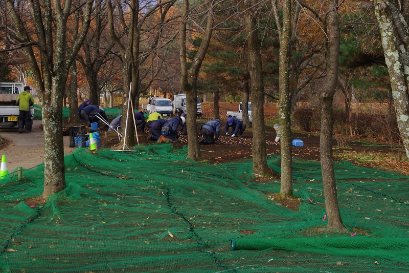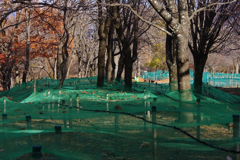 昨日、球根の植え付け作業が終わったチューリップ畑。畑の中の木の幹を飲み込んで張られたサル除けネットも完成していました。ちょっと面白いですね。