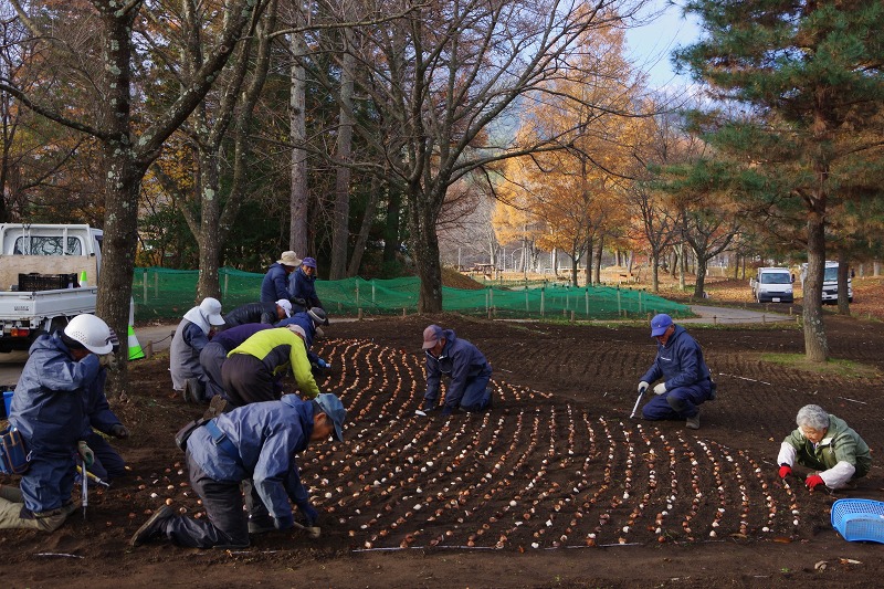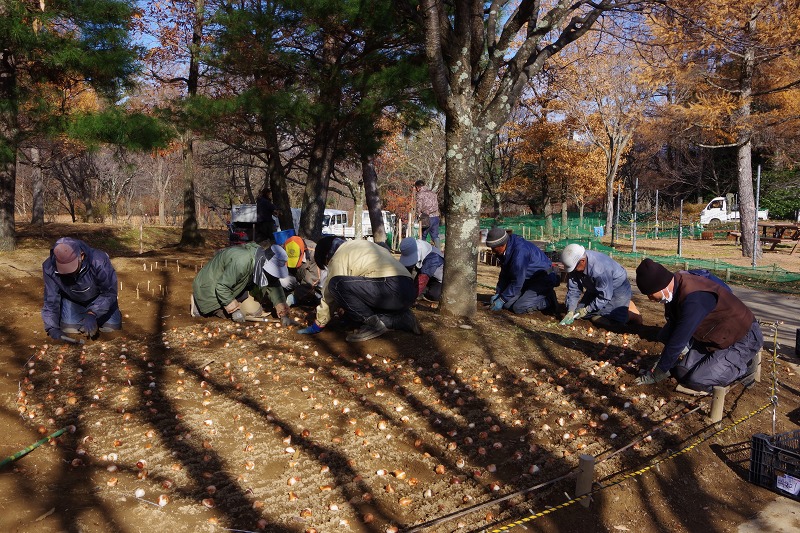 段々原っぱでは、チューリップの球根植え付け作業が続いています。〝植え付け戦隊 シルバーズ〟の皆さんは、朝7時半から作業が始まるのです。