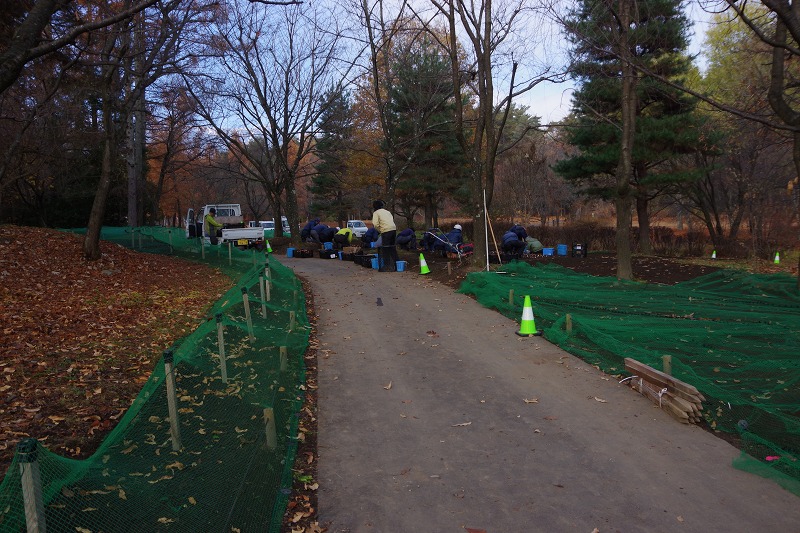そんな公園では、チューリップの球根植え付け作業が続いています。段々原っぱは終わって、水辺の休憩所近くの古墳横の林間までやって来ました。