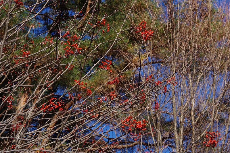 展望テラスの近くのナナカマド。赤い実は微量の毒が含まれるので鳥たちもすぐには食べません。冬の間に凍ることで毒が分解された実を食べるそうです。